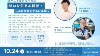 宮崎県中小企業家同友会きりしま支部の10月例会を開催致します!! テーマは「想いを伝える経営!〜会社を動かすのは仲間〜」です。 経営理念とは何か?どうやって作るのか?なぜ作るのか?どう共有するのか? … 続きを読む