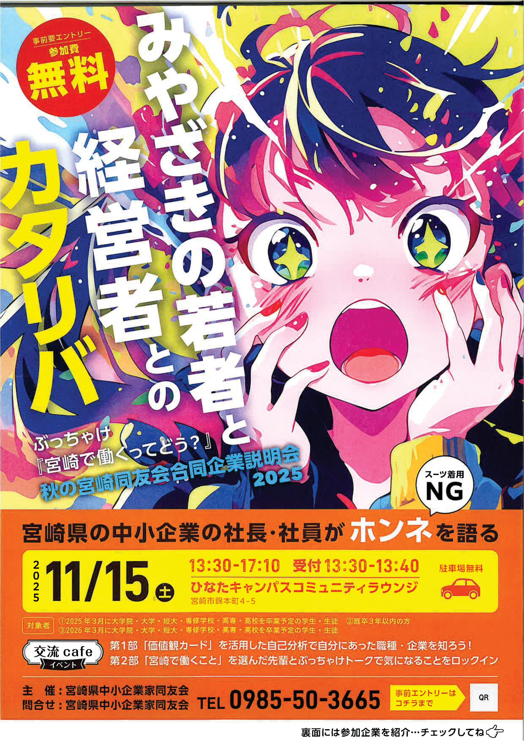 宮崎県内の中小企業15社の社長と社員さんと宮崎の学生さんが「宮崎で働く」ことについて語り合う場です。