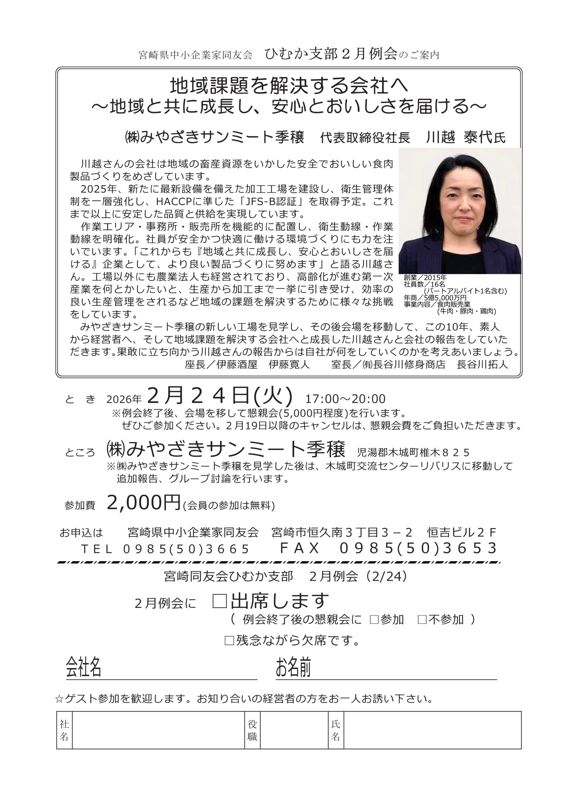 みやざきサンミート季穣の新しい⼯場を⾒学し、その後会場を移動して、この10年、素人から経営者へ、そして地域課題を解決する会社へと成⻑した川越さんと会社の報告をしていただきます。果敢に⽴ち向かう川越さんの報告からは⾃社が何をしていくのかを考えあいましょう。