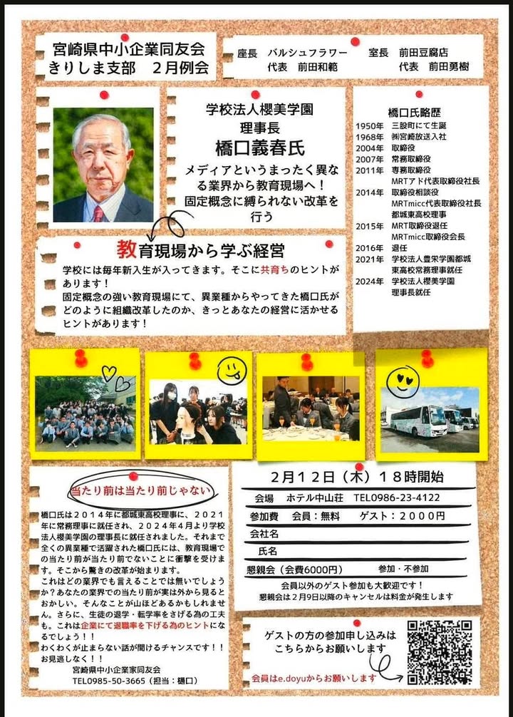今週の木曜日(2/12)に開催するきりしま支部の報告者は学校法人櫻美学園の橋口義春理事長‼️